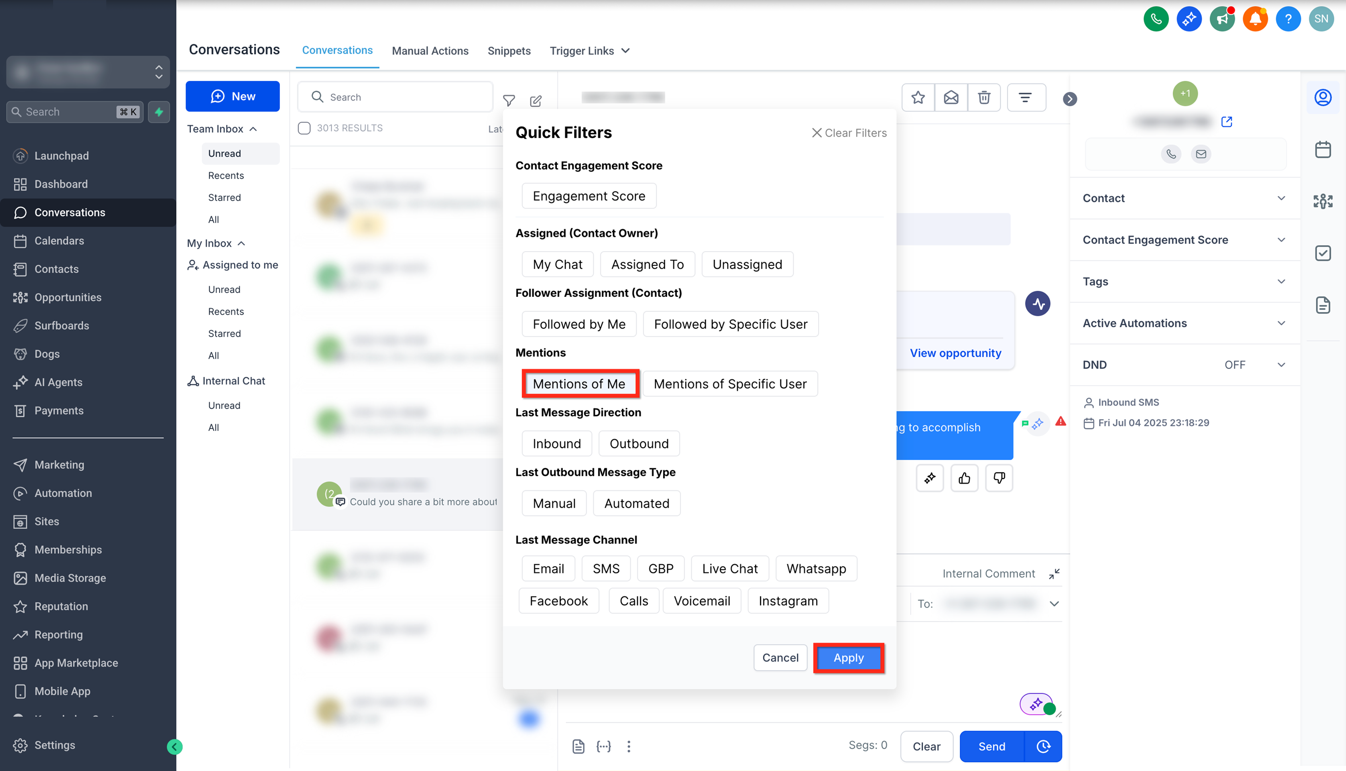Under the Mentions filter, select Mentions of Me and click Apply to view conversation where you are mentioned.