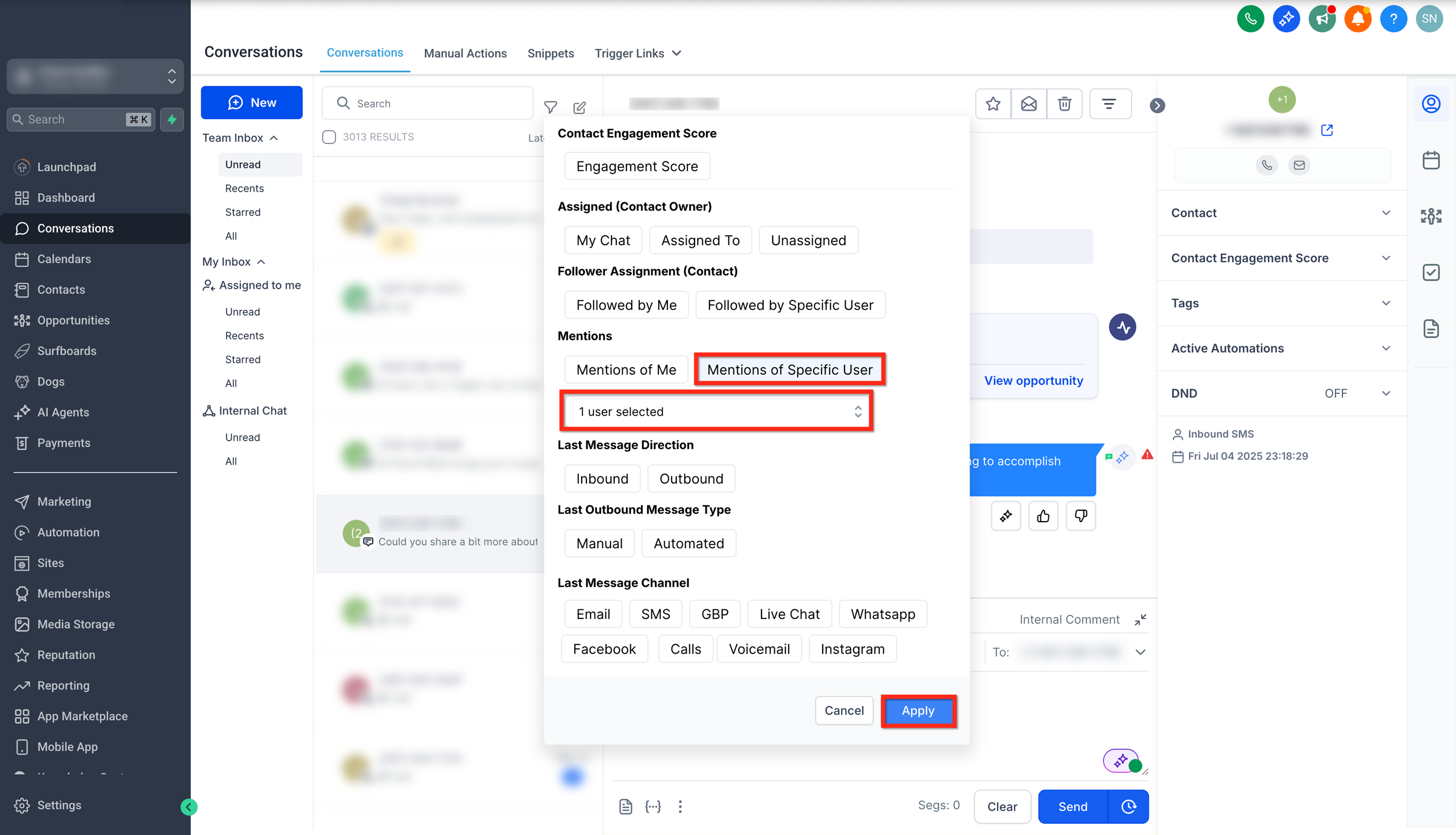 Or select Mentions of a Specific User option and select the user from the list and click on Apply to view conversations where specific users have been mentioned.