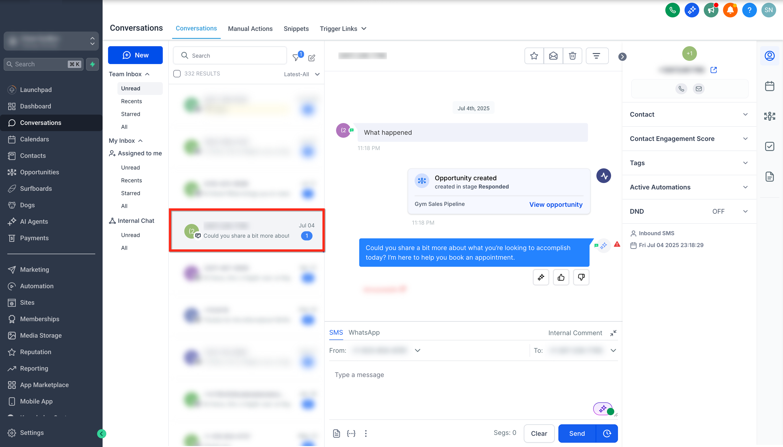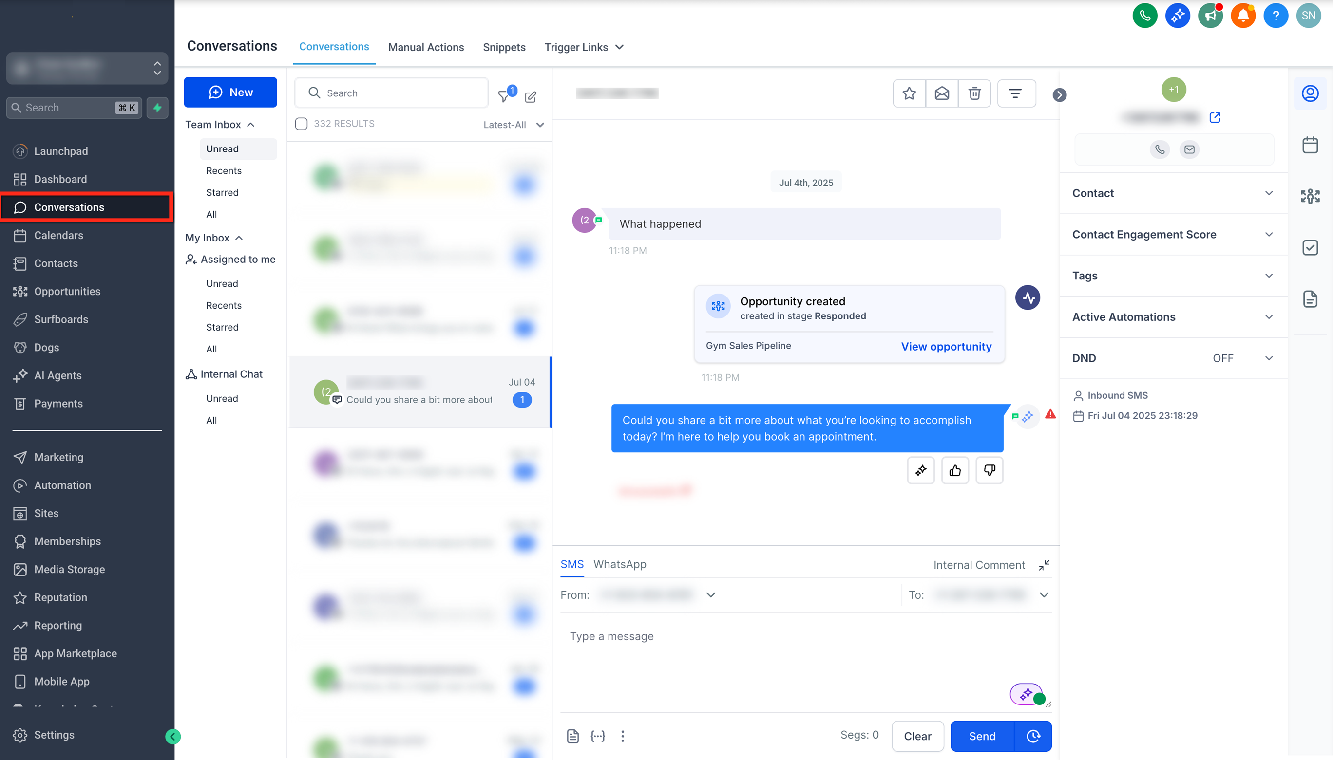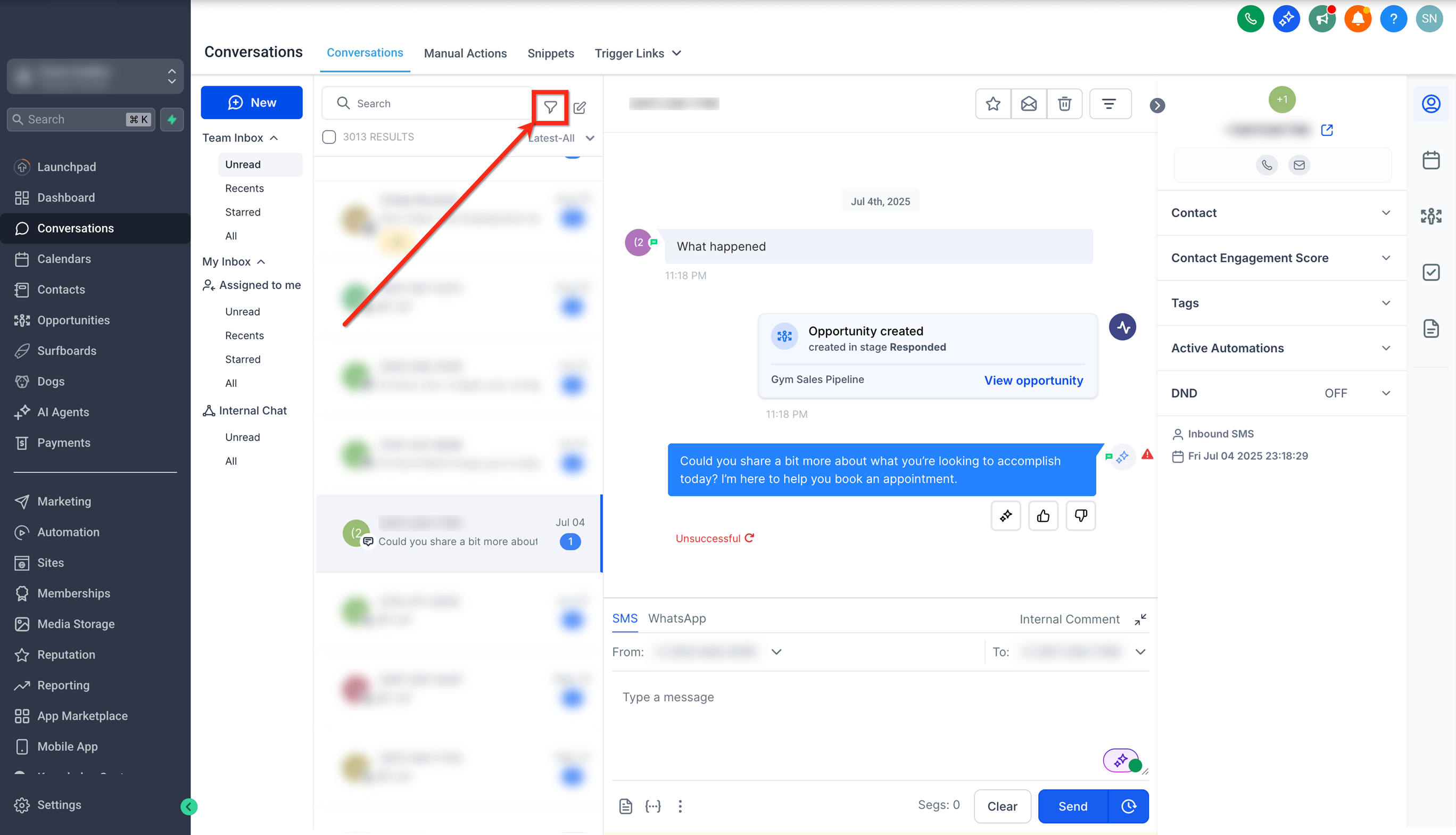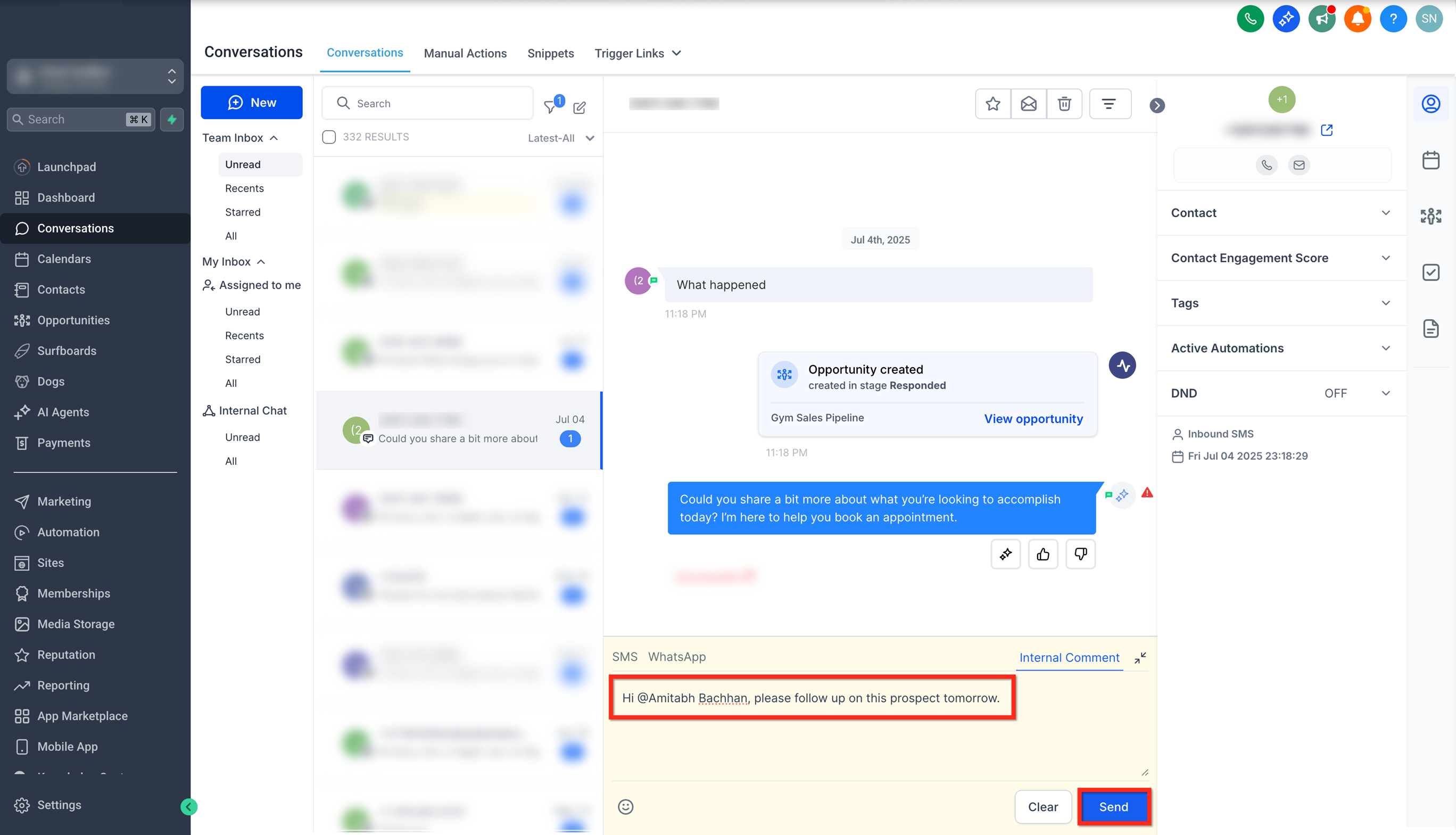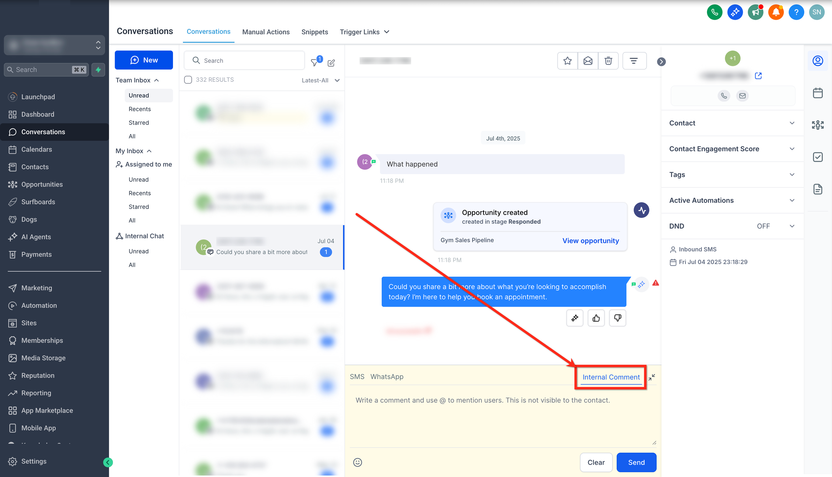 Open the conversation that you want to add the internal comment to by clicking on it.