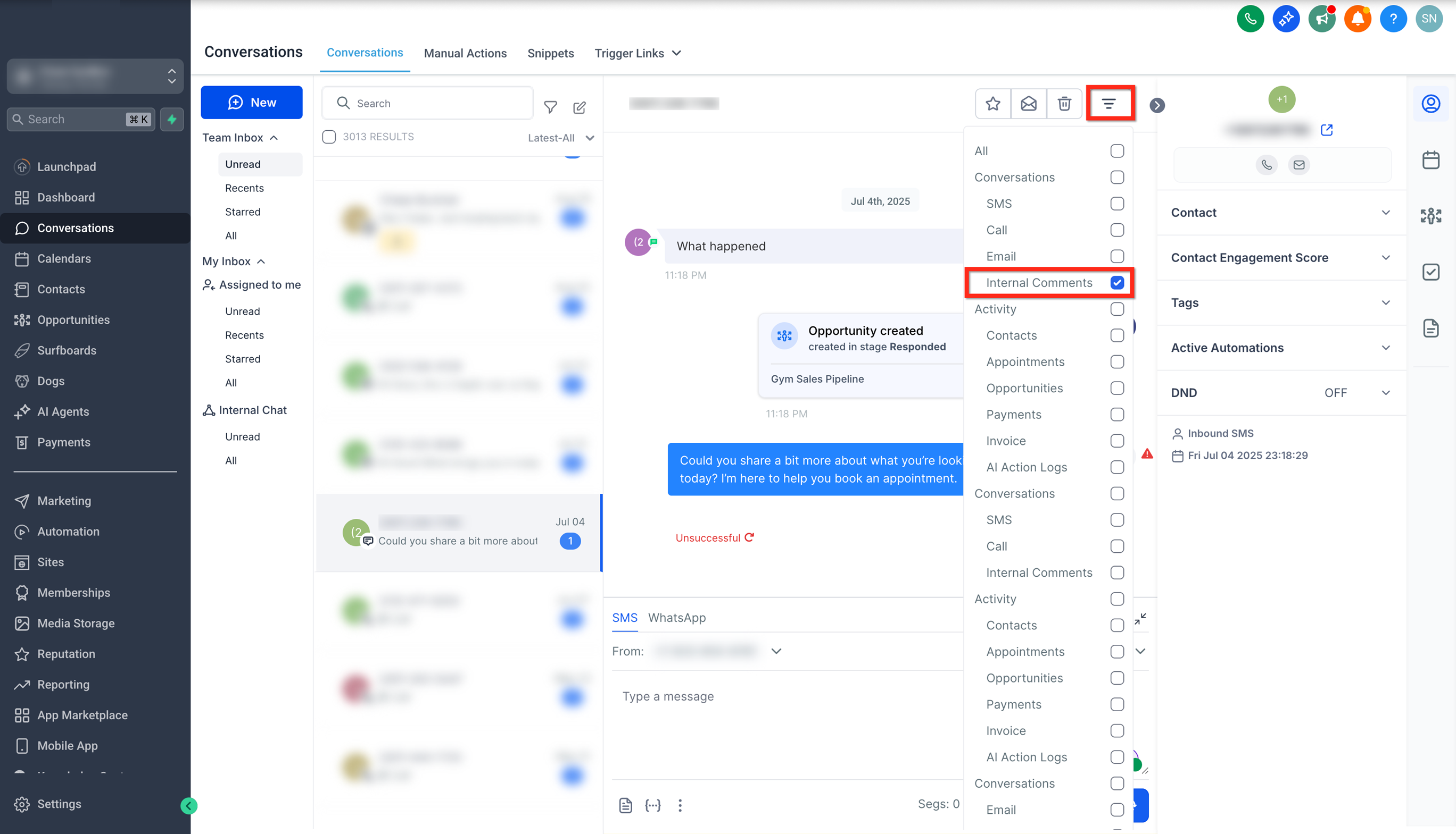 To see all internal comments in a conversation, click on the Filters button and apply the Internal Comments filter.