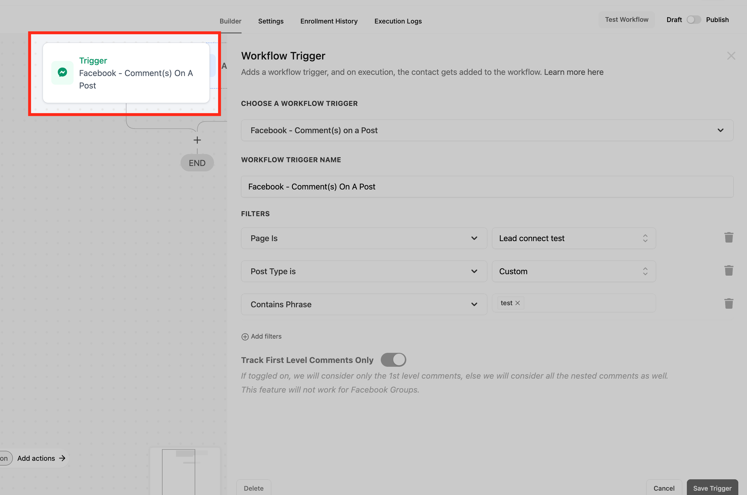 Set up a trigger, such as a customer comment on a Facebook or Instagram post, and select the specific post if needed.