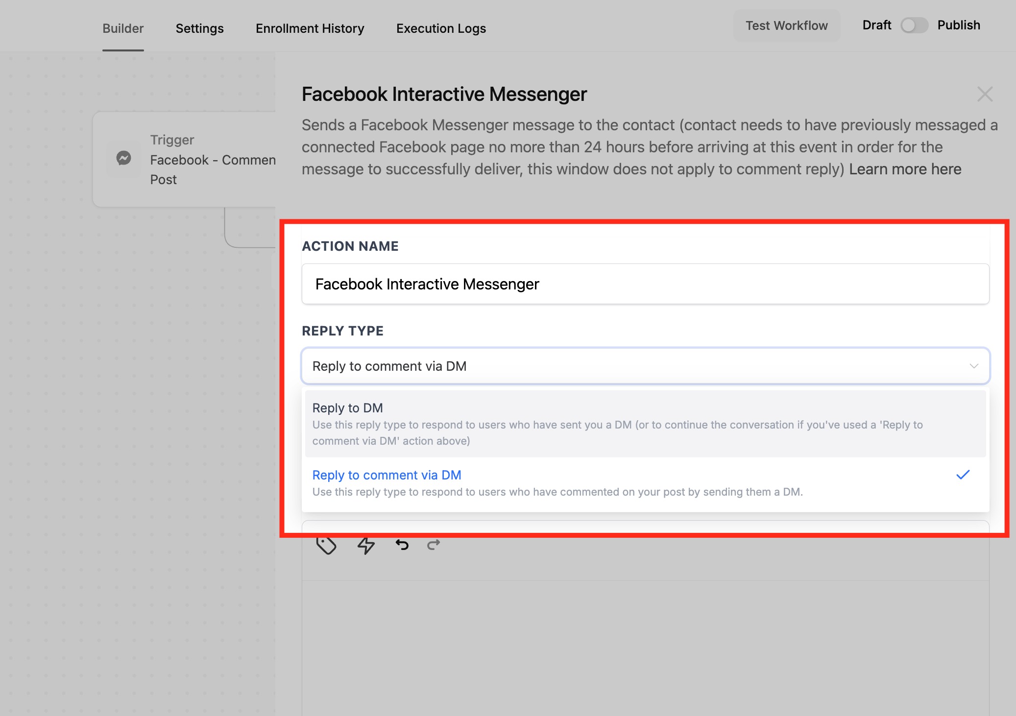 Choose “Reply to comment via DM” or “Reply via DM” under Facebook’s interactive messaging options. Set up your template or “Snippet” in the marketing section if it isn’t already done.