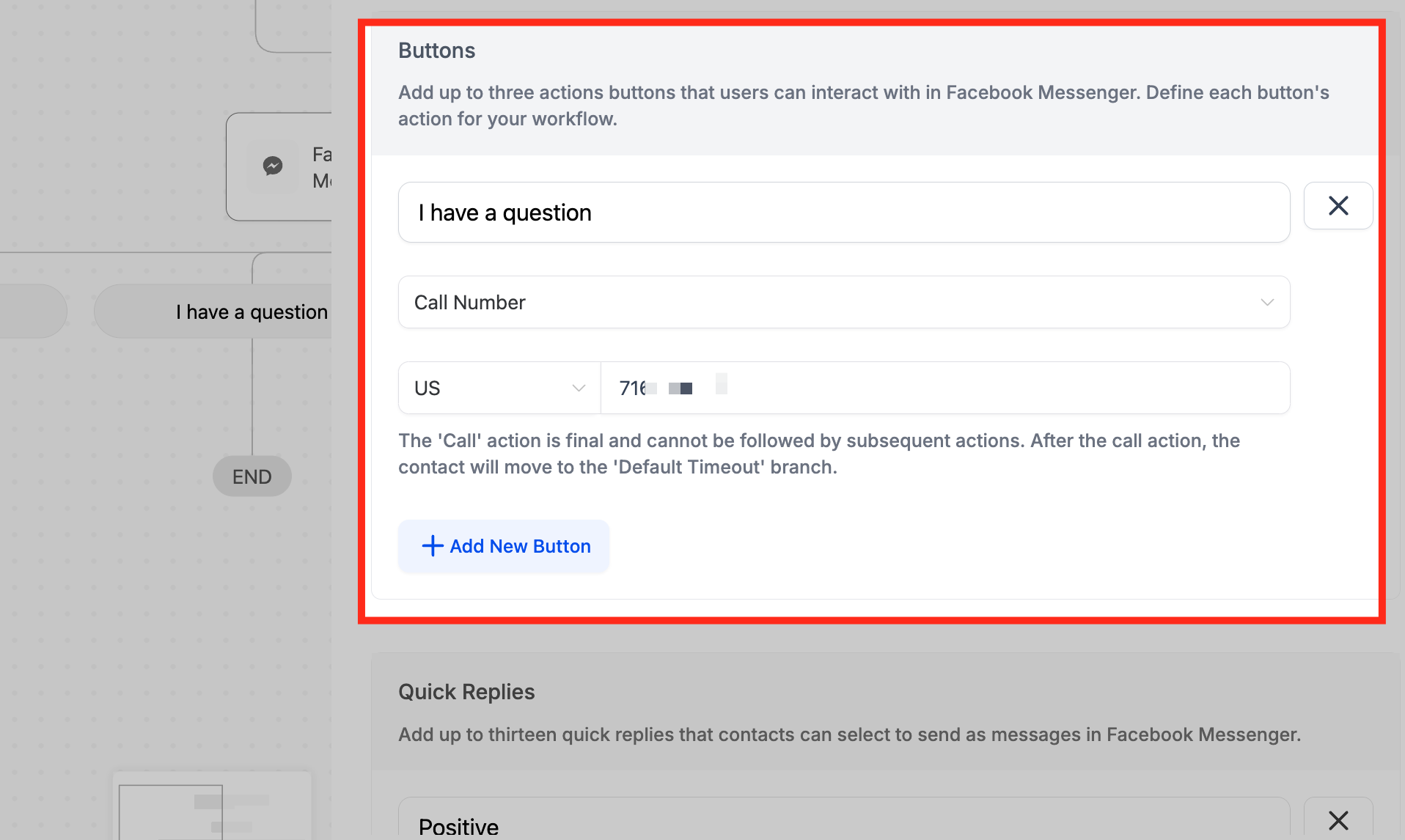 In the setup area, you can add buttons for predefined options. In the option below, we have added a button with the option "I have a question" and that leads them to the call the phone number.