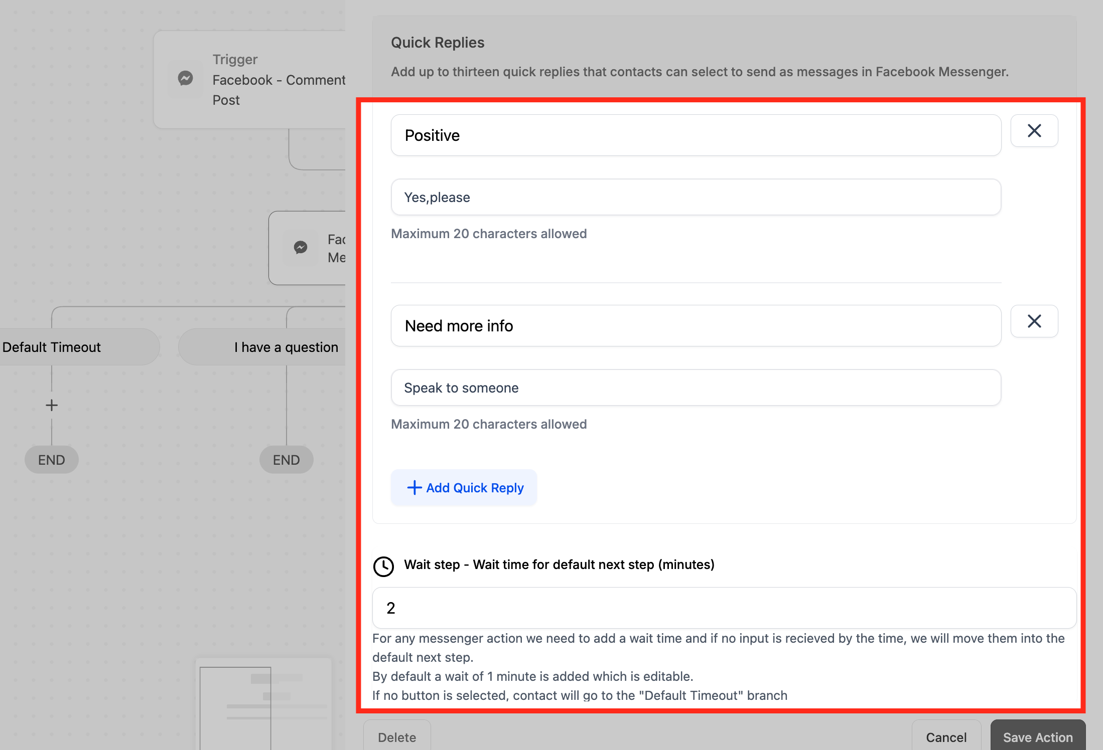 Quick replies can be configured for Facebook or Instagram, using the Workflow actions - Facebook Interactive Messenger and Instagram Interactive Messenger. You can configure up to 13 quick replies each with a maximum length of 20 characters.