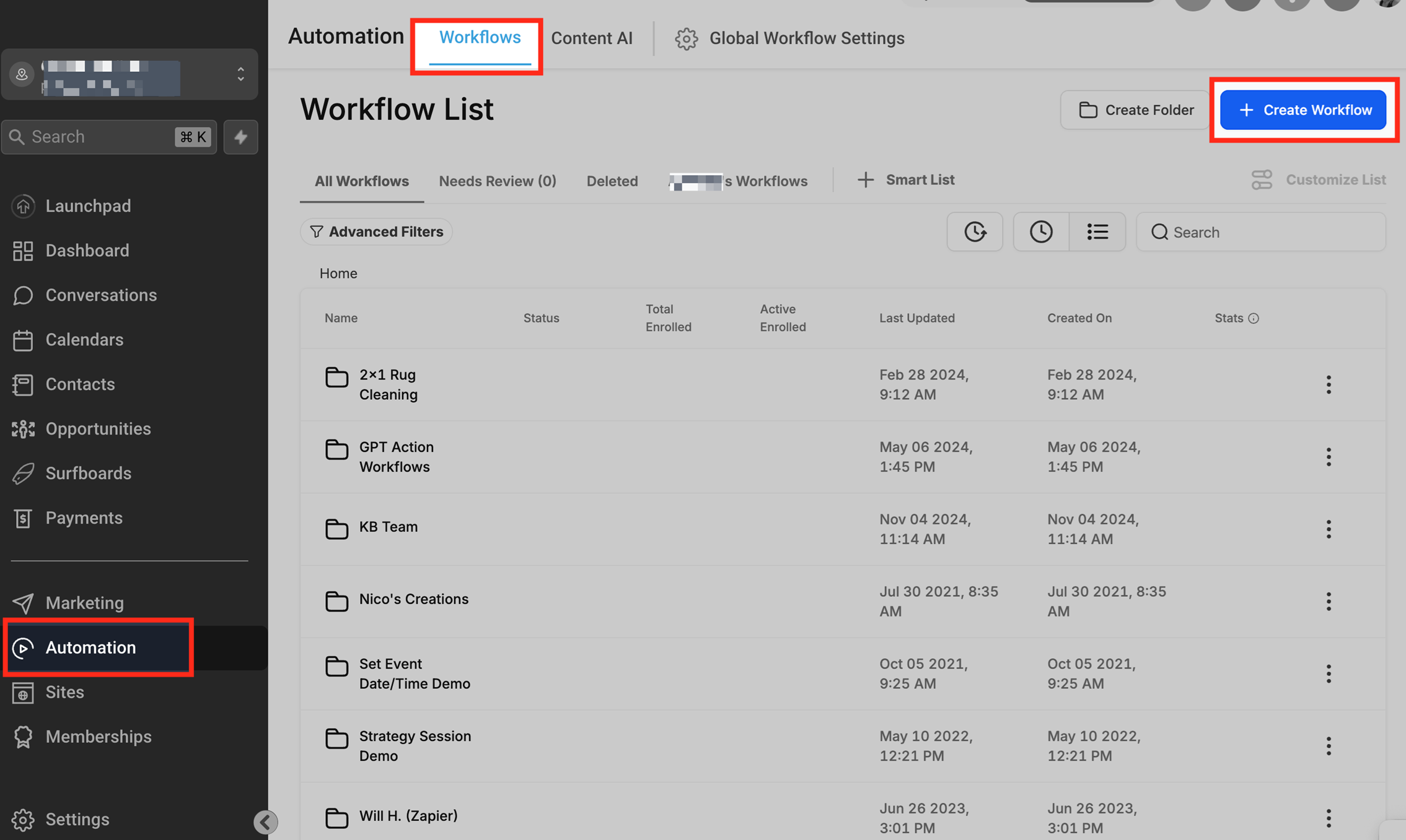 Navigate to the automation section in your dashboard, select “Workflows” at the top, and "Create Workflow" or edit an existing one.